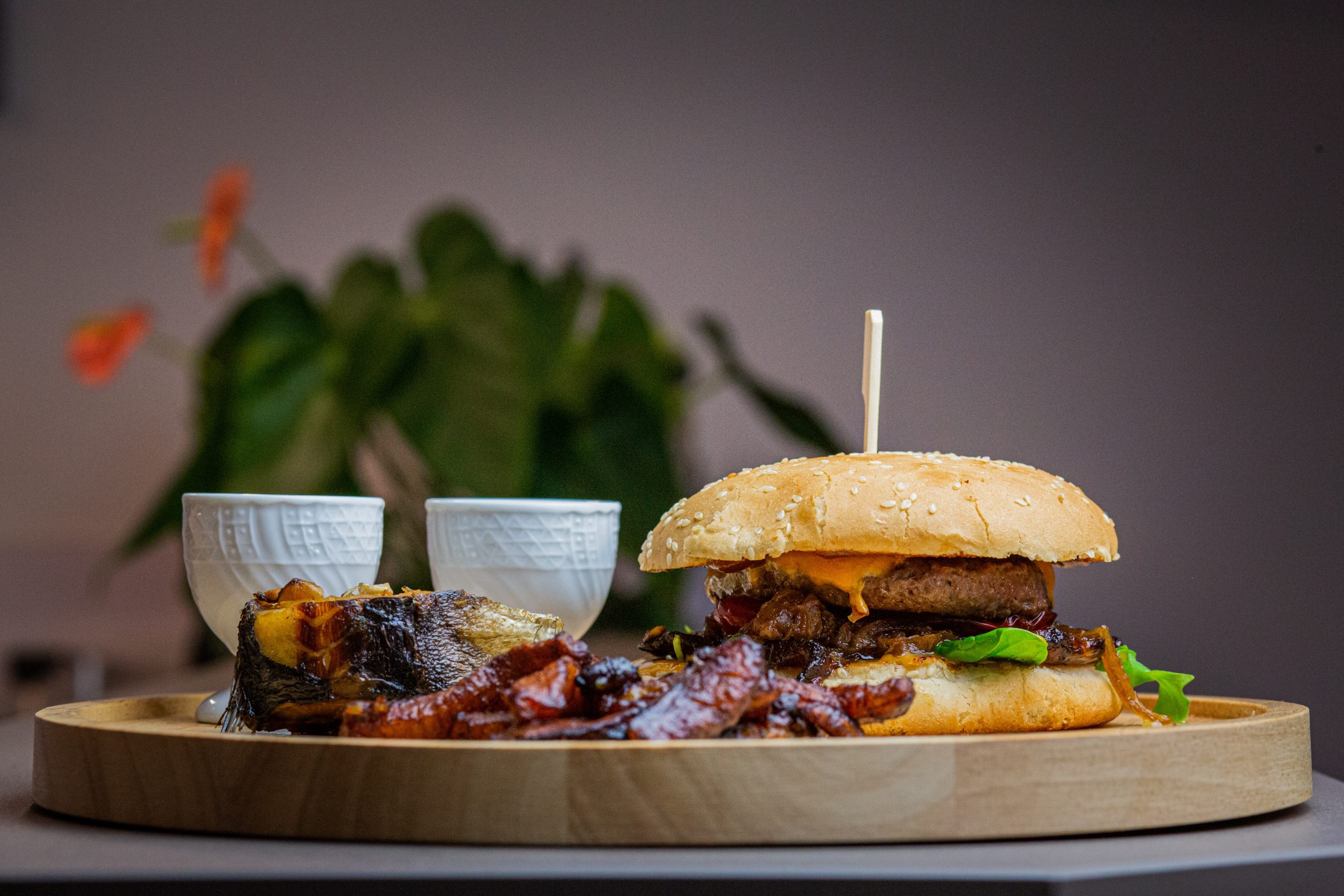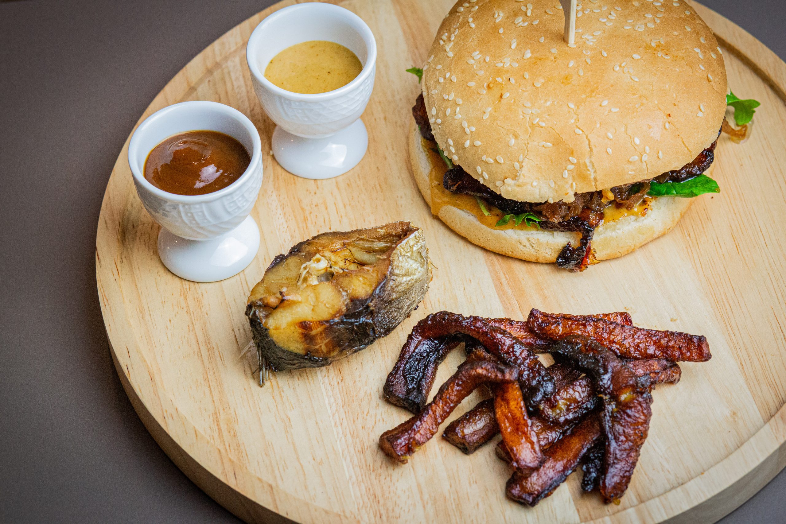 Burger-Gericht mit Backfisch und Kochbanane