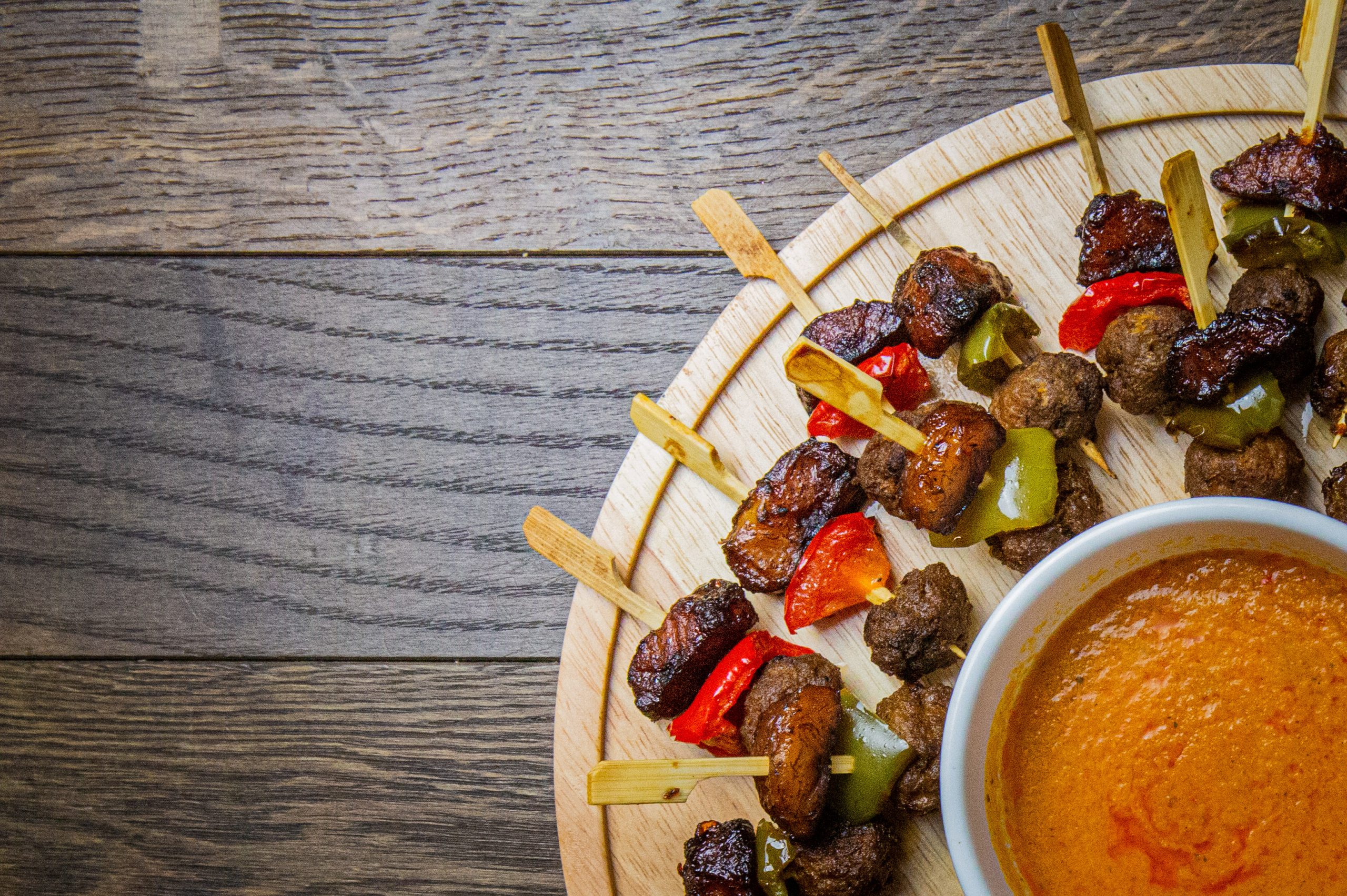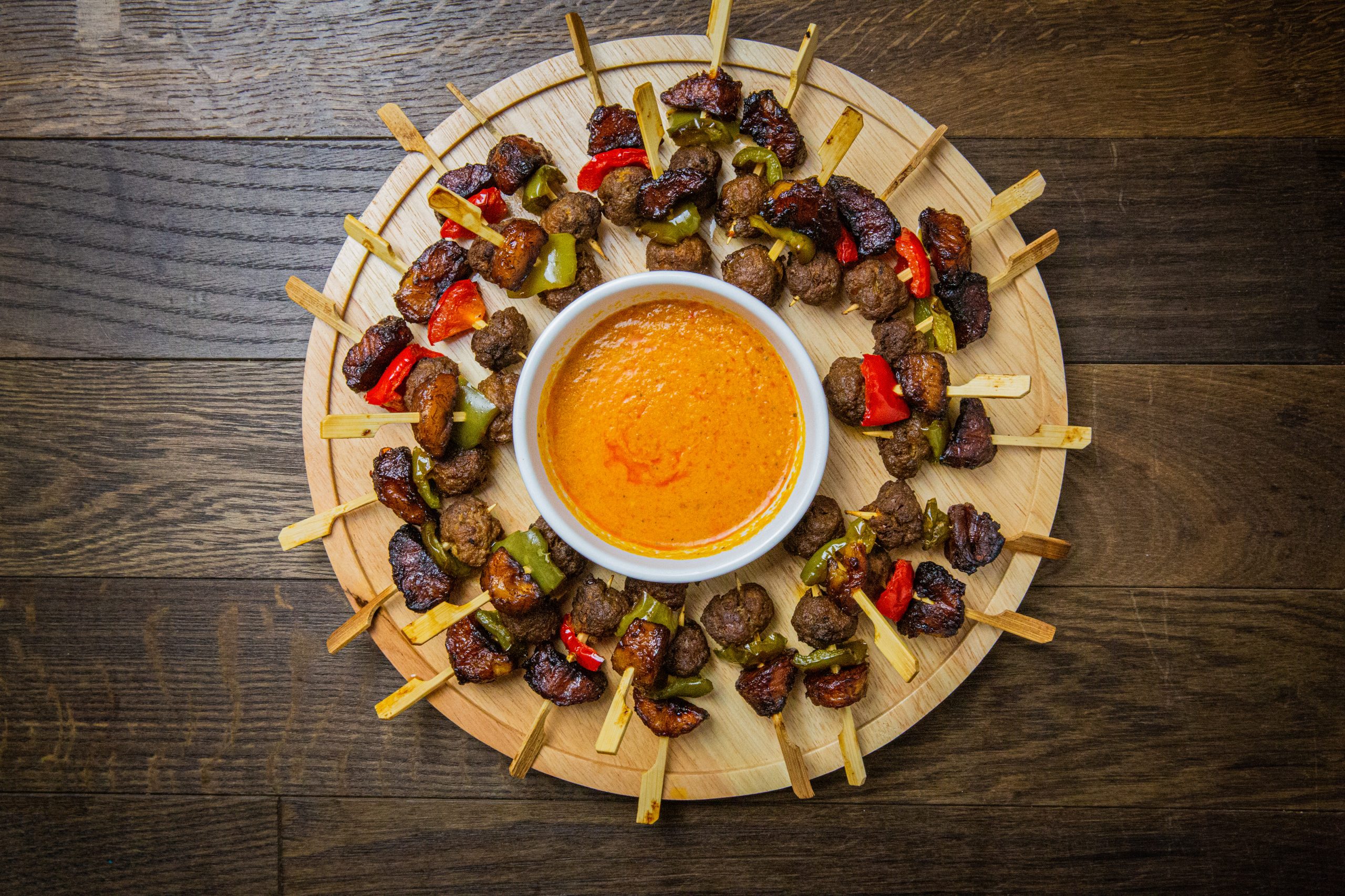 Fleischspieße vom Rind mit Grillgemüse und speziellem Dip